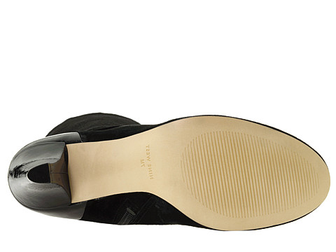 Parte superior da camurça com acentos da patente no eixo, copo do salto, e sobre o instep.